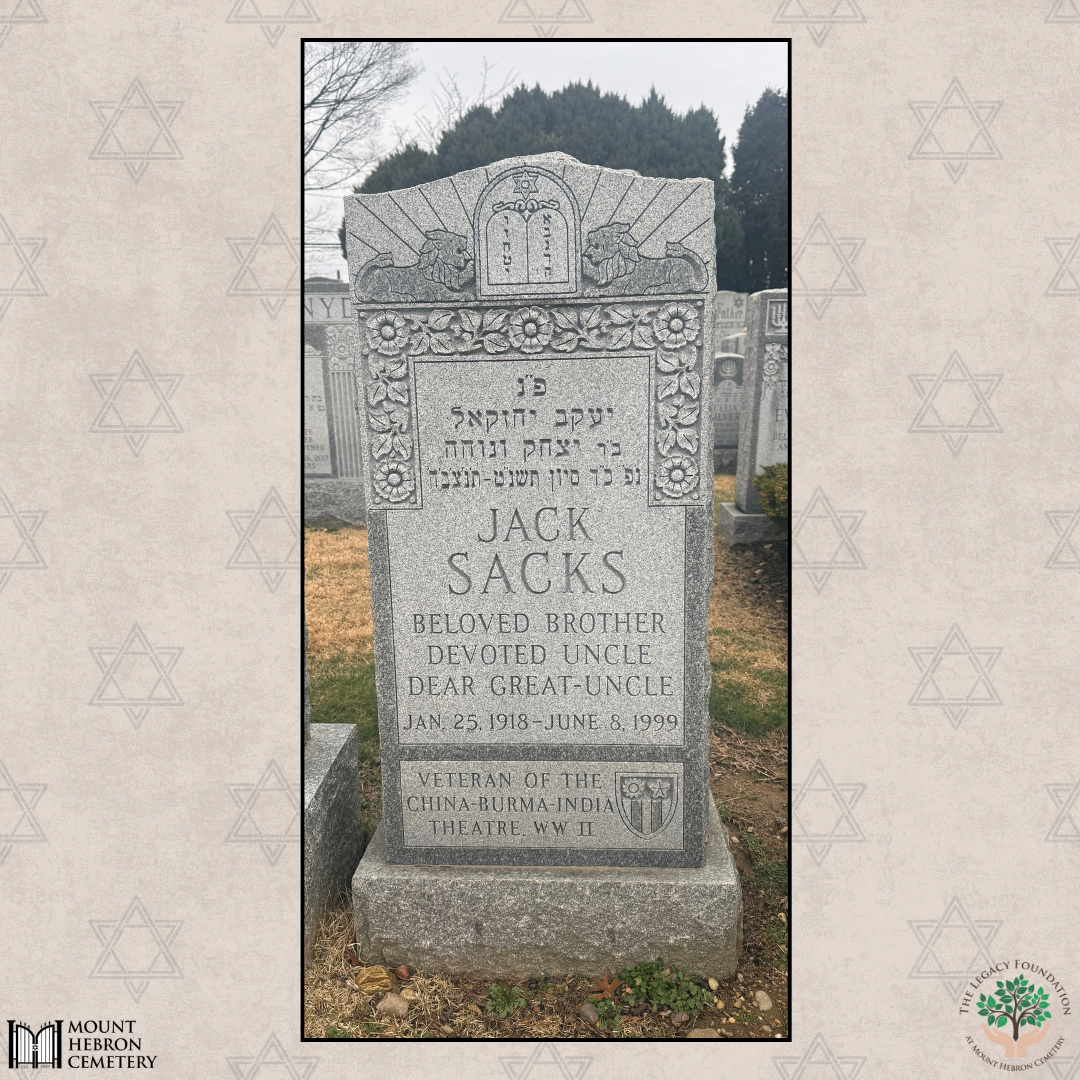 Jack Sacks, a Brooklyn native and World War II veteran, served in the U.S. Army's Ordnance Department with the 3198th Ordnance Base Depot Company in the China-Burma-India Theater from 1944 to 1946. Before the war he worked at the Brooklyn Navy Yard, leaving his job when he was drafted in 1943. Throughout his service he stayed closely connected to his parents and sister through affectionate letters, often referring to them as "the Magnificent Four." His time overseas left lasting memories, including a story about a Japanese sword he brought home that symbolized survival and the emotional weight of war. After returning home he briefly worked again at the Navy Yard before returning to the dry-cleaning trade, living a quiet life shaped by both wartime experiences and personal resilience. Today Jack Sacks rests at Mount Hebron Cemetery, where his story; preserved through letters, photographs, and family memories shared by his nephew continues to honor his service and legacy. ~ Blog by Deirdre Mooney Poulos & Sacks Family