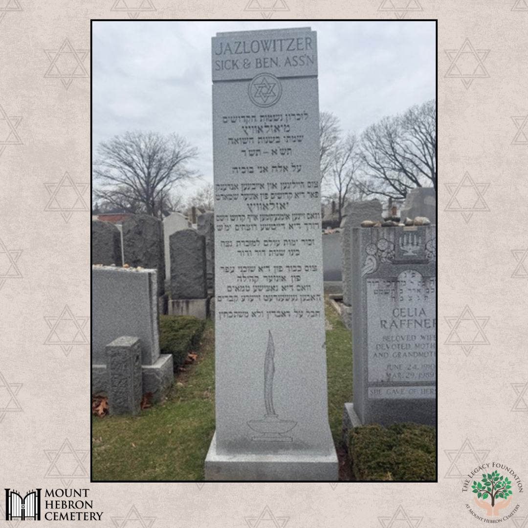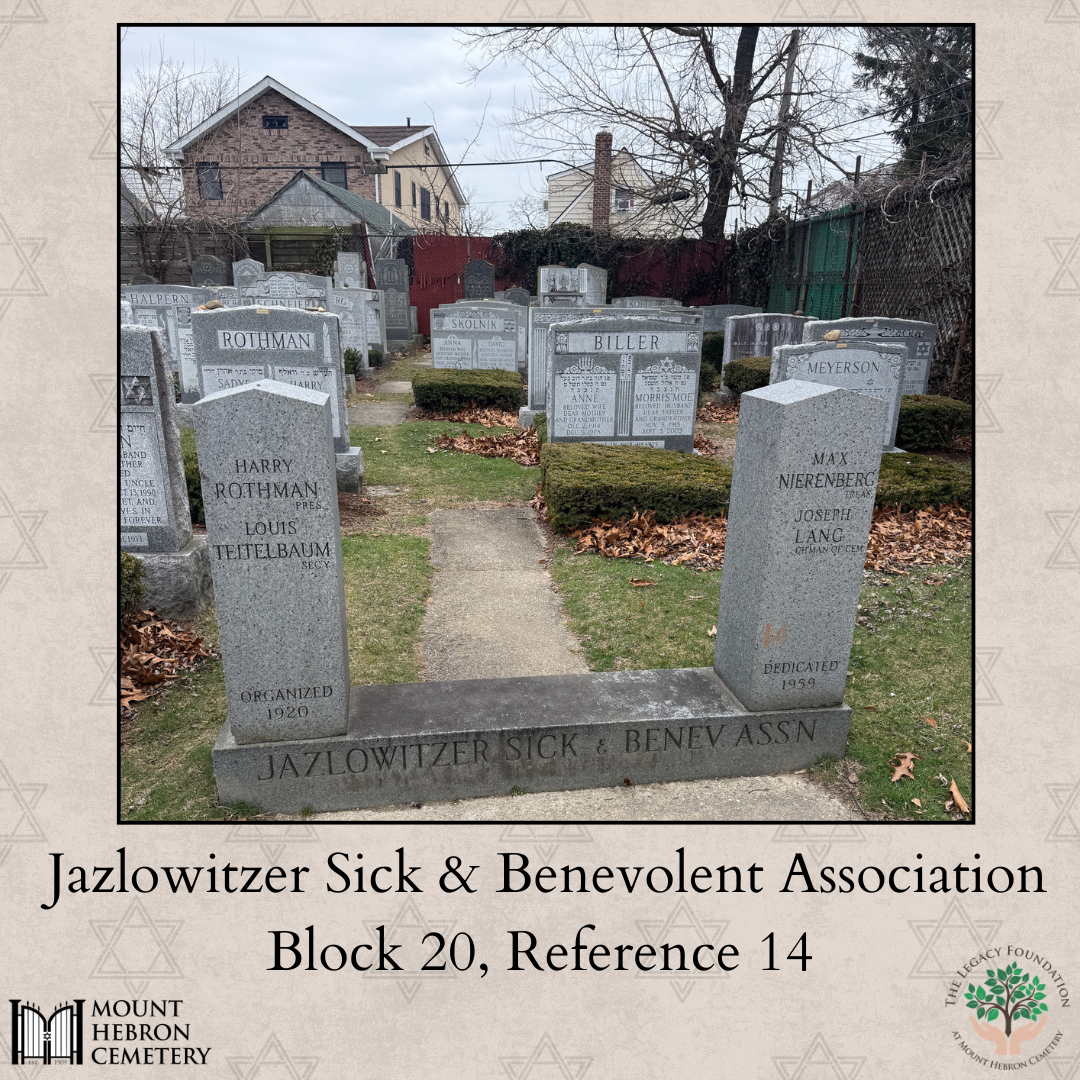 Like many landsmanshaftn from Eastern Europe, the Jazlowitzer Association purchased burial plots for its members at Mount Hebron Cemetery in Queens, New York. This section became a sacred space where families could be laid to rest among others from the same town. The society’s gate and monument at Mount Hebron still stand today, inscribed with the name Jazlowitzer Sick & Benevolent Assn., a testament to the immigrants who built a new life while honoring their roots.