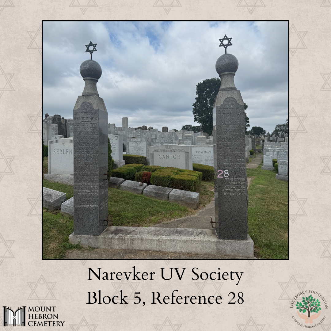 The Narevker UV Society was a Jewish immigrant benevolent group formed in New York in 1901 by former residents of Narewka, Poland, to provide support, burial plots, and a sense of community in their new homeland. Rooted in the traditions of a once-thriving village later destroyed in the Holocaust, the society preserved the memory of Narewka through its cemetery plot at Mount Hebron and one of the earliest Holocaust memorials in Queens. Though the society eventually faded, it stands as a powerful example of how immigrant communities sustained identity, connection, and remembrance across generations and continents. ~Blog by Deirdre Mooney Poulos